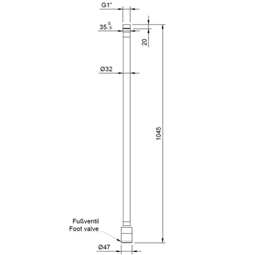 Sauglanze DN25 (d32) aus PE elektrisch leitfähig mit Fussventil Anschluss unten am Multi Flex Block® einschraubbar, für Entnahme aus IBC-Containern - Durchfluss: max. 1000 l/h - ohne Niveaukontakte - Werkstoff: PE-el elektrisch leitfähig, schwarz - Baulänge 1000 mm - mit Gewindenippel G1 Aussengewinde, unten vertikal am Multi Flex Block® einschraubbar - Saugrohr d32x3 mm SDR11 Fussventil zur Richtungsbegrenzung und Ansaugung von Fluiden - Ein Zurückströmen der Flüssigkeit entgegen der Durchflussrichtung wird zuverlässig verhindert - Abmaße: d 47 x 100 mm - Eingang mit Sieb-Bohrungen d 3 mm - Borosilikatglaskugel d 25mm - Kugel dichtet durch Eigengewicht/Wassersäule auf O-Ring - Fussventilgehäuse angeschweißt, gekapselt, demontierbar - O-Ringe wahlweise EPDM, FPM oder FEP-FPM (FEP-ummantelt) - Einbaulage vertikal - elektrisches Potential wird abgeleitet, geeignet für Ex-Zone 1 und 2 |