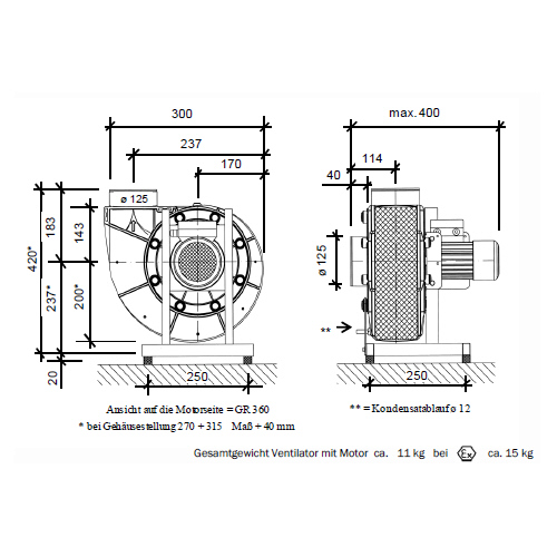 Direktgetriebener Radialventilator zur Förderung aggressiver Gase, Temperatur max 40°C Gehäuse aus PPs, in gespritzter Ausführung mit integrierten Dichtungssystem, bestehend aus Kondensatwehr als umlaufende Tropfkante und einer Labyrinthdichtung, Kondensatablaufstutzen an der tiefsten Gehäusestellung Laufrad mit rückwärtsgekrümmten Schaufeln aus PPs, in gespritzter Ausführung mit Rückenbeschaufelung für garantierten Unterdruck an der Wellendurchführung im Betrieb Gehäusestellung GL, Ausblasrichtung 45° / 90° / 135° / 180° / 270° / 315° /360° Grundrahmen: Stahl-verzinkt Antrieb : Normmotor 3 x 230/400V, 50 Hz, IP55, Wärmeklasse F mit Thermokontakt Zubehör : Gummi -Schwingungsdämpfer Volumenstrom m3/h 70 - 610 Druckdifferenz PA 440 - 140 Schutzart PTC (Kaltleiter) Polzahl 2 Sync. Drehzahl bei 50 Hz 3000 1/min Motorleistung kW 0,12 Nennstrom bei 400 V 0,5 A Baugröße 56 Bauart B5 / IP55 |