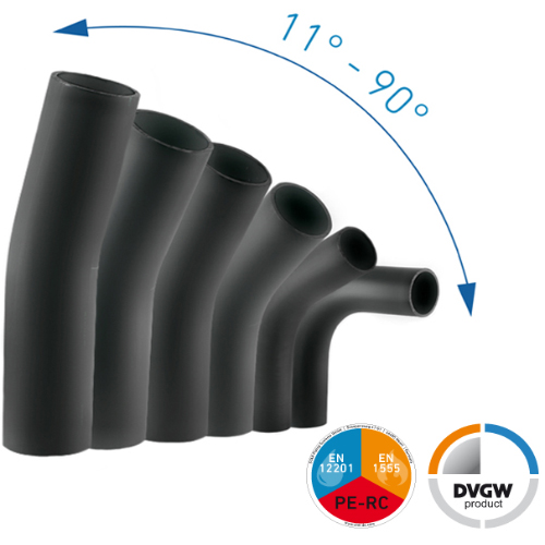Nach jahrelanger Forschung sind wir als erster und einziger Hersteller in der Lage, normkonforme DVGW zertifizierte nahtlose Bögen mit „r ≈ 1,5 x d“ zu fertigen, die nach DIN EN 12201-3 und DIN EN 1555-3 die geforderte Mindestwandstärke einhalten und damit selbst für größte Beanspruchung optimale Voraussetzungen gewähren. Produkte mit DVGW-Kennzeichen geben die Gewissheit, dass es sich um hochwertige Produkte handelt, die in jeder Hinsicht den anerkannten Regeln und dem aktuellen Stand der Technik entsprechen.