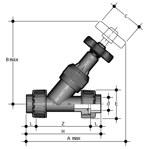 PVC-U Schrägsitzabsperrventil, Klebemuffe, FPM