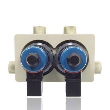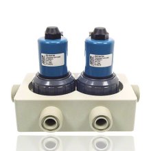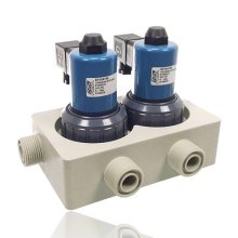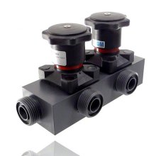 Nebenstehend dargestellt, ist ein Mehrwegeventil aus PP mit zwei Magenventilantrieben Typ 150: