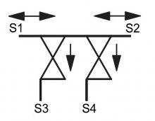 - Durchgang S1 auf S2, Medium z.B. als Ringleitung permanent anstehend, aus dem Volumenstrom S1/S2 können durch Schalten der Antriebe die Anschlüsse S 3 und S4 mit Medium versorgt werden