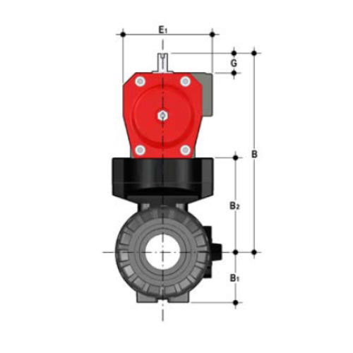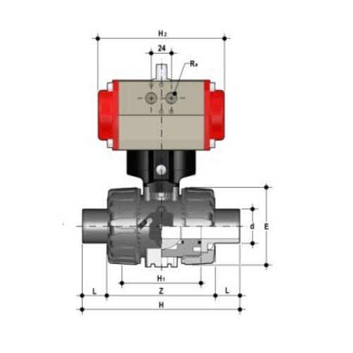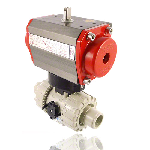 | 2/2-Wege-Kugelhahn mit gesicherten Überwurfmuttern aus PP mit pneumatischem Stellantrieb Funktion: normal geöffnet, inklusive optischer Stellungsanzeige Steuerdruck: Standard 5 bar reduzierter Steuerdruck: auf Anfrage Steueranschluss: G 1/8' Namur (DN15 - DN25) G 1/4' Namur (DN32 - DN100) Anschlussart: Stutzen zum Heizelementmuffenschweißen Dichtung: PTFE/FPM |