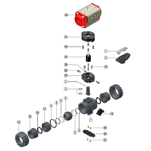 Entdecken Sie unsere pneumatischen Kugelhähne aus PVDF, PVC-C, ABS, PVC-U und PP - die bevorzugte Wahl in der Verfahrenstechnik. Unsere robusten VKD-Kugelhähne mit feststellbaren Überwurfmuttern bieten zuverlässige Lösungen für industrielle Anwendungen. Je nach Anlage und Infrastruktur können wir Ihnen sowohl elektrische als auch pneumatische Ausführungen liefern. In der pneumatischen Ausführung stehen Ihnen die Varianten "Normal offen" (NO), "Normal geschlossen" (NC) und "Doppelt wirkend" (DA) zur Verfügung. Ihre Vorteile bei uns:- Größen von DN 10 mm bis DN 50 mm - Maximaler Betriebsdruck von 16 bar bei 20°C - Die neue Sperrvorrichtung sichert die Überwurfmuttern unter verschiedenen Einsatzbedingungen wie Vibrationen oder thermischer Ausdehnung zuverlässig in Position. - Dank des einfachen Ausbaus der Armatur aus dem Rohrleitungssystem können O-Ringe oder Kugelsitze schnell und werkzeuglos ausgetauscht werden. - Die Kugelabdichtung ist durch eine präzise Mikro-Justierung frei von Rohrleitungskräften und gewährleistet eine leckagefreie Trennung der drucklosen Seite der Leitung. Pneumatischer Antrieb:- Spezielle Aluminiumlegierung für den Einsatz in aggressiven Umgebungen - Speiseanschlussstücke nach NAMUR-Normen gebohrt - Obere Bohrung zur Befestigung von Zubehör und oberes Ritzelende gemäß VDI/VDE 3845 Normen. Anschlussmöglichkeiten:Unsere Kugelhahnreihe entspricht den folgenden Normen für verschiedene Anschlussarten: - Klebeanschluss PVC-U: EN ISO 1452, EN ISO 15493, ISO 727, DIN 8062, DIN 8063, ASTM D2467, BS -1, ISO 727-2, JIS K 6743, JIS 6741-2 - Klebeanschluss PVC-C: EN ISO 15493, ISO 727-1, ASTM F439 - Schweißanschluss PP-H: EN ISO 15494 - Schweißanschluss PVDF: EN ISO 10931 - Gewindeverbindung: ISO 228-1, DIN 2999, ISO 7-1, ASTM D2467, ASTM F437, BS 21, BS 10226, JIS B 0203 - Flanschanschluss: ISO 2084, EN ISO 1092-1, EN ISO 1452, EN ISO 15493, EN 558, ISO Auf Anfrage erhältliches Zubehör:- Optische Stellungsanzeige - Elektro-pneumatischer Stellungsregler - Pneumatischer Stellungsregler - Endschalter - 3-5/2-Wege-Vorsteuerventile Alle oben genannten Informationen wurden mit größter Sorgfalt und bestem Wissen erstellt. Dennoch können daraus keine verbindlichen Ansprüche abgeleitet werden. Weitere Informationen finden Sie im Dropdown-Menü neben dem Artikel oder kontaktieren Sie uns gerne telefonisch. |