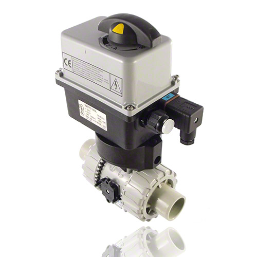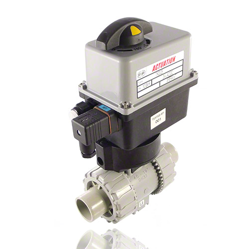 2/2-Wege-Kugelhahn mit gesicherten Überwurfmuttern aus PVC-C mit elektrischem Stellantrieb