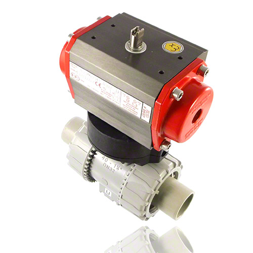| 2/2-Wege-Kugelhahn mit gesicherten Überwurfmuttern aus PVC-C mit pneumatischem Stellantrieb Funktion: normal geöffnet, inklusive optischer Stellungsanzeige Steuerdruck: Standard 5 bar reduzierter Steuerdruck: auf Anfrage Steueranschluss: G 1/8' Namur (DN15 - DN25) G 1/4' Namur (DN32 - DN100) ***DN65-100 PN16 auf Anfrage Anschluss: Klebestutzen Dichtung: PTFE/EPDM |