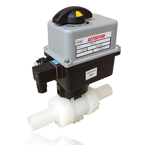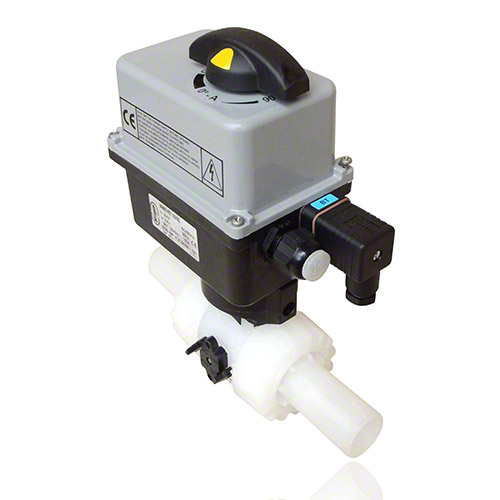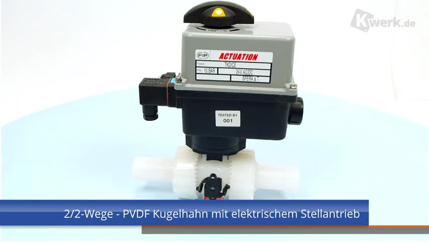 2/2-Wege-Kugelhahn mit gesicherten Überwurfmuttern aus PVDF mit elektrischem Stellantrieb