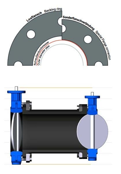 Mit kunststoffbeschichtetem Sphäroguss- oder Stahlflansch. Ausführung abhängig von der SDR-Klasse und DN/D-Kombination.