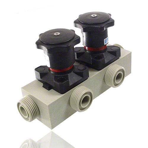 Mehrwegeventil aus PP mit zwei Handantrieben, Abgang reduziert, Membrane PTFE