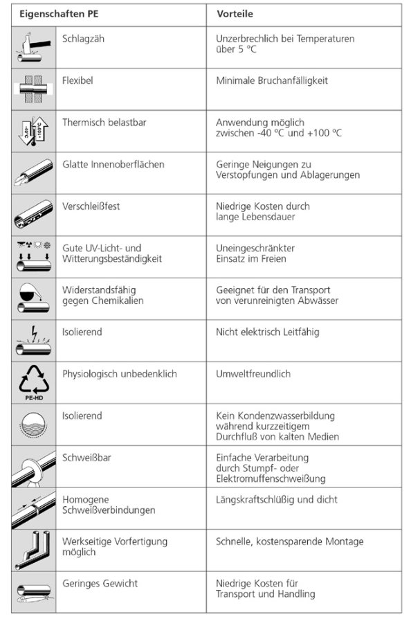 Alle nachfolgenden Angaben sind mit größter Sorgfalt und bestem Wissen erstellt worden. Aus dem Inhalt kann jedoch keine Verbindlichkeit abgeleitet werden. Polyethylen ist ein teilkristalliner Kunststoff. Aufgrund seiner mechanischen Eigenschaften, seiner chemischen Widerstandsfähigkeit und besonders aufgrund seiner hohen Schlagzähigkeit ist Polyethylen ein prädestinierter Werkstoff im Rohrleitungsbau geworden. Kwerk.de liefert auf Wunsch Rohre aus den hochmolekularen PE-Typen wie PE 100 und PE 80 (nur bei SDR33 lagerhaltig), während gespritzte Druckrohrformteile in PE 100 gefertigt werden. Formteile im Abflußbereich werden weiterhin in PE 80 geliefert. Gerne senden wir Ihnen auf Anfrage ein attraktives Angebot zu Alle Artikel finden Sie auch im Webshop |