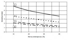 Innendruckbelastbarkeit von unverstärkten Sattel-T-Stücken aus PE 100 SDR 17Werte gelten für Wasser von 20°C; Standzeit 25 Jahre und einem Sicherheitsfaktor von 1,6 Grundrohr- und Abgangsstutzen-Maße in mm Druckangaben in bar |